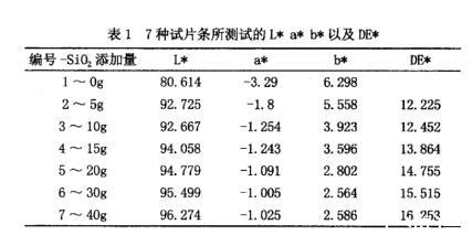 由表1可以看出,選擇沒(méi)用添加二氧化鈦的高溫尼龍HTN即1~0g做為標(biāo)準(zhǔn)樣,并測(cè)試其L*,a*,b*數(shù)值,2~5g,3~10g,4~15g,5~20g,6~30g,7~40g做為比較樣。從數(shù)據(jù)上進(jìn)行比較,隨著添加量的增加,2號(hào)~7號(hào)色差DE*逐漸增加,即試樣表現(xiàn)得越來(lái)越白,2號(hào)~3號(hào)添加量增加5g,雖然L*值變化不明顯,但是b*值變化還是蠻大的,此比例不能說(shuō)明添加量已經(jīng)達(dá)到飽和狀態(tài)。4號(hào)~5號(hào)添加量增加5g,L*數(shù)值變化0.7,5號(hào)~6號(hào)隨著添加量繼續(xù)增加10g,L*數(shù)值只變化0.7,說(shuō)明隨著二氧化鈦添加量的增加,體系所表現(xiàn)的顏色趨于飽和。