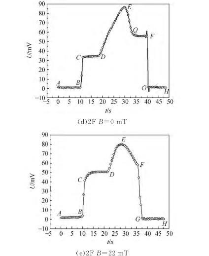 使用拉脫法測量了磁性液體的磁表面張力,無外加磁場作用時,磁性液體的表面張力小于其載液的表面張力,磁性液體液膜拉得更長,液膜收縮的趨勢比白油更明顯,這主要是因為磁性液體中加入的表面活性劑降低了其表面張力。由液膜拉脫過程電壓變化曲線可觀察到:不同條件下磁性液體的電壓變化情況不同,無外加磁場作用時2F號磁性液體在EF階段存在轉(zhuǎn)折點Q,越過轉(zhuǎn)折點,QF階段電壓變化較平緩,且表面張力越小;而7#白油和1F磁性液體并未出現(xiàn)此現(xiàn)象,這主要是因為7#白油和1F磁性液體表面張力較大,2F號磁性液體由于表面張力較小,其液體分子與分子之間的作用力較弱,宏觀表現(xiàn)為拉脫的液膜更長,液膜在空氣中會存在一段時間。有外加磁場作用時,2F號磁性液體在FG階段并未出現(xiàn)電壓變化平緩的中間過程,但FG階段出現(xiàn)了另一些數(shù)據(jù)點,液膜破裂的時間大于無外加磁場作用時的時間,主要是由于外加磁場增強了磁性顆粒之間的相互作用,分子和分子之間的磁吸引力增強,導(dǎo)致液膜逐步破裂。