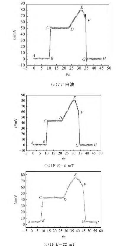計算機實時在線采集了2種磁性液體及白油液膜拉脫過程中電壓隨時間的變化曲線,如圖4所示。從圖4可看到,3種液體的電壓變化規(guī)律一致,圖中F和G兩點是液膜破裂前后瞬間的電壓值,片狀吊環(huán)的內(nèi)外徑分別為33.10mm和34.69mm,根據(jù)(6)式即可計算出液體的表面張力。室溫(20±0.5)℃時各液體的表面張力見表2.7#白油的表面張力大于磁性液體,這主要是因為表面活性劑的加入降低了液體的表面張力。當22mT的磁場作用于磁性液體時,磁性液體的表面張力增加,這主要是因為無外加磁場作用時,各磁性顆粒的磁矩方向雜亂無章,互相抵消,磁性液體不顯示宏觀磁性。當外加磁場作用于磁性液體時,且磁場方向平行于切線方向的磁性液膜時,各磁性顆粒的磁矩方向轉(zhuǎn)向外加磁場方向,外加磁場增強了磁偶極子之間的相互作用,導(dǎo)致磁性液體的表面張力增加。