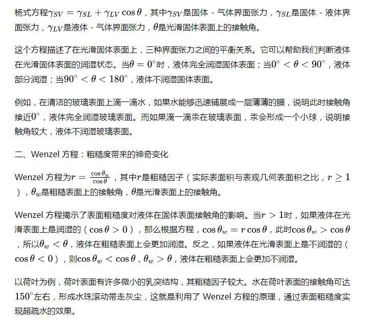 基礎聯系:楊式方程描述了光滑固體表面上的界面張力平衡,而Wenzel方程則在考慮表面粗糙度的情況下,建立了粗糙表面接觸角和光滑表面接觸角之間的聯系。兩者共同為我們理解液體與固體表面的相互作用提供了理論基礎。