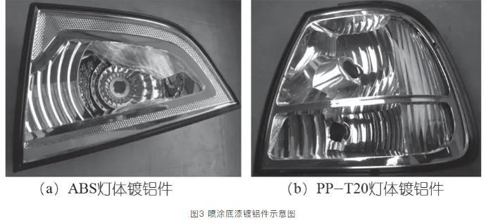 PP-T20和ABS表面張力都是較低,與鍍鋁層結合力較差,通過噴涂底漆獲得較好地表面張力,提高附著力。如圖3(a)所示為ABS材料加工汽車后霧燈體,ABS表面張力為34~38 mN/m,ABS是三元共聚物,內在的成分比例有些差異,表面張力是個范圍值,可噴涂底漆(涂料低聚物環(huán)氧丙烯酸酯)改善ABS表面張力。