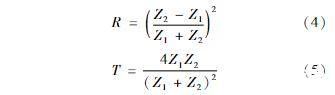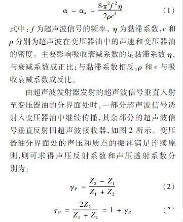 由超聲波發射器發射的超聲波信號垂直入射至變壓器油的分界面處時,一部分超聲波信號透射入變壓器油中繼續傳播,其余部分的超聲波信號垂直反射回超聲波接收器,如圖2所示。變壓器油分界面處的聲壓和質點的振速滿足連續原則,則可求得聲壓反射系數和聲壓透射系數分別為: