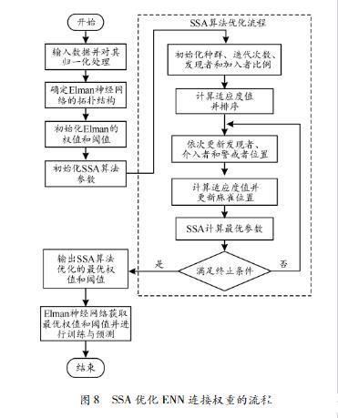 3.2.2SSASSA是模擬麻雀群體覓食和反捕食行為提出的群智能優化算法。圖8展示了SSA優化ENN連接權重的流程。