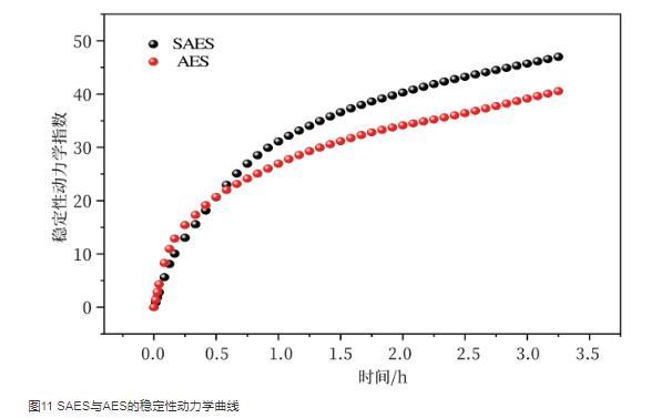 穩定性動力學指數(di)反映的是樣品在整個放置時間濃度和顆粒粒徑的變化幅度的綜合值,穩定性動力學指數越大,系統越不穩定。圖11為SAES與AES的穩定性動力學曲線,從圖中可以看出,在開始的0.5 h內,SAES與AES的穩定性動力學指數幾乎相同,但隨著時間的增加,SAES的穩定性動力學指數明顯高于AES,說明在開始的0.5 h內,二者的泡沫穩定性幾乎相同,但是隨著時間的延長,SAES體系的穩泡性明顯弱于AES,這是由于帶有一定支鏈的SAES分子在氣-液界面上形成的表面膜黏度低,不夠緊密結實,泡沫穩定性較差。