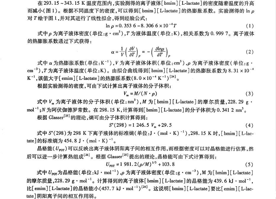 離子液體物理化學性質的研究對離子液體的設計和應用具有重要的指導作用,而對于離子液體與分子溶劑(例如水)的混合物性質研究將會揭示該類液體的新的應用。筆者在不同溫度下測定帶有手性陰離子的純離子液體1-丁基-3-甲基-咪唑乳酸鹽([bmim][L-lactate])及[bmim][L-lactate]+H2O二元混合物的密度和表面張力,并對其體積性質和表面性質進行研究。以期進一步豐富手性離子液體與分子溶劑二元混合物的物理化學性質數據,為其應用提供更多的理論依據。