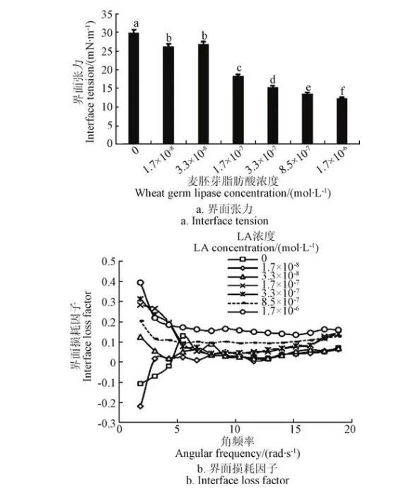 三油酸甘油酯濃度對油水界面特性的影響見圖6。由圖6可見,當麥胚LA濃度為1.70×10-6mol/L時,油水界面張力隨癸烷中三油酸甘油酯濃度的增加呈現(xiàn)先增加后減小的變化規(guī)律;當三油酸甘油酯濃度介于10-5~10-3mol/L時,相同角頻率時界面損耗因子隨著濃度增加無明顯變化規(guī)律。此外,在試驗過程中,界面張力隨時間延長呈現(xiàn)一定下降趨勢,這說明麥胚LA與三油酸甘油酯的水解過程也會對界面張力產(chǎn)生一定影響。原因在于,在界面體系中,三油酸甘油酯可被麥胚LA水解,產(chǎn)生小分子的油酸等,三油酸甘油酯與麥胚LA組成的界面發(fā)生變化,進而影響界面特性。