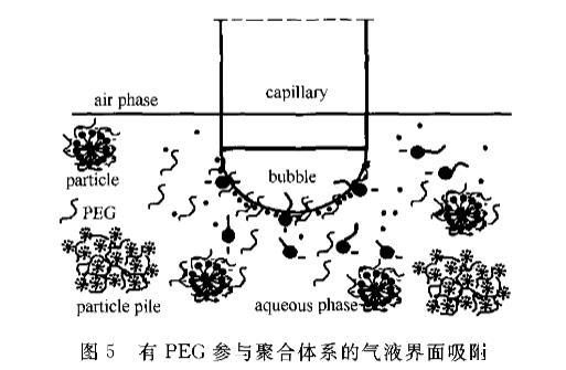 由圖3可見,有PEG參與的聚合體系。5rain的DST與圖2相比變化起伏較大,有先低后急升再緩降的變化模式,與一般的DST呈單調減小的趨勢有很大不同。這是因為在反應剛開始體系中除了單體、齊聚物和膠粒,又增加了PEG,而且PEG與齊聚物、膠粒作用形成粒子堆口]。PEG是完全水溶性物質,在體系水相中的濃度遠遠大于單體和齊聚物,但擴散速率要小于單體及齊聚物,因此一開始部分新形成的氣液界面會由擴散速率最快的單體迅速占領,而隨時間推移PEG借助濃度優(yōu)勢會替代單體占據氣液界面,如圖5所示,最終達到平衡,由單體、齊聚物和PEG共同覆蓋整個氣液界面。PEG水溶液的氣液界面張力要比單體的氣液界面張力大得多,因此在水相中有大量單體存在的情況下,此聚合體系的DST會出現(xiàn)先低后急升的曲線形狀。這個狀況會一直持續(xù)到30rain時,可以看出,PEG使體系直到30min時仍有大量游離單體存在于水相,而無PEG參與的體系此時已無單體游離在水相中。這一點可以從圖6轉化率一時間曲線得到證實,無PEG參與的體系30min時已接近聚合終點,而有PEG參與的體系轉化率才只有25左右。待反應至50min時,DST趨勢平穩(wěn),水相中游離的單體已經很少,此時轉化率在49左右,說明單體已基本進入到膠粒中。這個狀態(tài)一直維持到60min時。75min時的體系有很大變化,從宏觀看粒徑發(fā)生轉變,由大變小。從DST曲線看氣液界面張力明顯提高,轉化率已快速增加到95,接近終點。此時體系中對DST的貢獻主要以脫離粒子堆的成熟粒子l3和PEG為主。