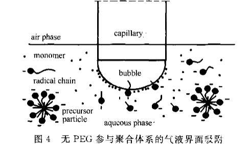 由圖2可見,無PEG參與的聚合體系中,隨聚合進行,體系所表現(xiàn)的氣液界面張力趨勢為逐漸增大,從5min的28mN·m~左右到6Omin的60~65ITIN·m~,75min則稍有回落,在55~61mN·m。各時間段的DST趨勢較為平穩(wěn)。這種氣液界面張力隨聚合進行逐漸上升的趨勢較為符合無皂乳液聚合反應機理。在反應初期水相中不僅有溶解在水中的單體,還有引發(fā)形成的齊聚物,這種齊聚物一端帶有疏水鏈段,另一端帶有親水性的一SO引發(fā)劑碎片,具有表面活性。當齊聚物達到膠束濃度時會聚并成基本粒子,由幾十個到上百個齊聚物組成。溶解在水相中的單體分子量相對齊聚物小很多,體積小,擴散速率快,極易遷移至氣液界面。對于一開始的反應,體系中仍有大量單體存在,水相中的單體濃度基本保持在飽和狀態(tài),因此大部分氣液界面首先由單體等物質占據,還有極少部分的界面由具有表面活性的齊聚物覆蓋,如圖4所示。所以與圖1對比會發(fā)現(xiàn),5min時的氣液界面張力非常接近單體本身的氣液界面張力。隨聚合進行,水相中的單體逐漸耗光,氣液界面張力開始逐漸上升,此時到達氣液界面的則主要是齊聚物和膠粒,相對單體的遷移速率要慢很多,因此10min以后的DST衰減斜率要大于5rain時的。