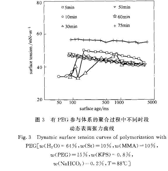 由于PEG的存在,使St/MMA在水相中經歷了不一樣的聚合過程,PEG會使體系的反應速率變慢,當反應到50min時轉化率只有49,而無PEG參與的體系在30min時聚合已接近終點,轉化率達到98以上。St/MMA和引發(fā)劑形成的聚合物在PEG的作用下,形成了一種具有更強表面活性的聚合物,其表面活性水平高于PEG以及無PEG參與的聚合體系的聚合物,但弱于混合單體及齊聚物。這種較強表面活性的聚合物在轉化率只有5的時候就已經存在,是聚合物進入粒子堆形成小粒子且穩(wěn)定粒子的動力,并最終使粒子帶有足夠脫離粒子堆的表面電荷。
