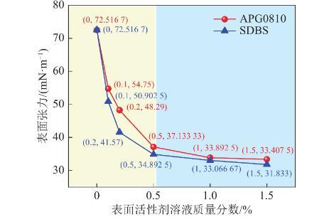 SDBS和APG0810表面活性劑溶液表面張力隨質量分數變化如圖4所示,隨著表面活性劑溶液質量分數增加,表面張力逐漸降低,降低幅度逐漸減緩。