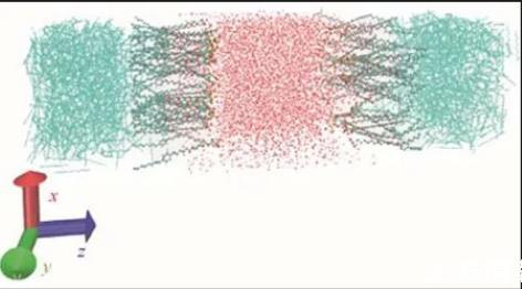 在進行分子動力學模擬之前構建出合理的力場是極為重要的工作。本文通過Autom-ated Topology Builder(ATB)and repository生成的GROMOS系列力場參數,利用現有的數據庫以及量子化學進行計算,同時它可以充分考慮到分子中的對稱結構,使其反映出的分子性質及參數更為精確。但ATB只能處理原子數小于40的分子,對于分子數大于40的分子結構需進行拆分。在獲取準確的電荷及鍵參數之后利用packmol程序定向排列分子將其堆砌成立方體結構。此外,本文選取的油-水界面需使表面活性劑平均分布在水相兩側,親水基靠近水相,疏水基靠向油相。圖2為初始狀態下體系截圖,其中中間紅色部分為水分子,左右兩側藍色部分為癸烷分子,油水中間即OPES分子。