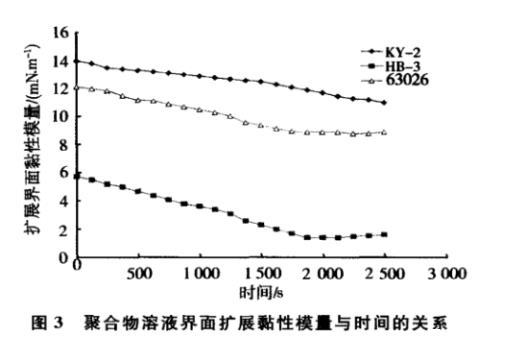 圖2、圖3分別是用蒸餾水配制濃度為1 500 mg/L的3種聚合物溶液測(cè)量的擴(kuò)展彈性模量、擴(kuò)展界面黏性模量。界面活性較高的聚合物(HB-3)的界面彈性模量在20~27 mN/m之間變化,其它兩種聚合物的界面擴(kuò)展彈性模量為60~70 mN/m。其相應(yīng)的界面黏性模量比界面彈性模量低,說(shuō)明三種聚合物溶液的界面擴(kuò)展彈性占主導(dǎo)。綜上所述,聚合物(KY-2)界面擴(kuò)展黏彈性最好,說(shuō)明界面層中聚合物分子之間以及聚合物與油分子之間作用比另外兩種聚合物界面層的分子間作用大。