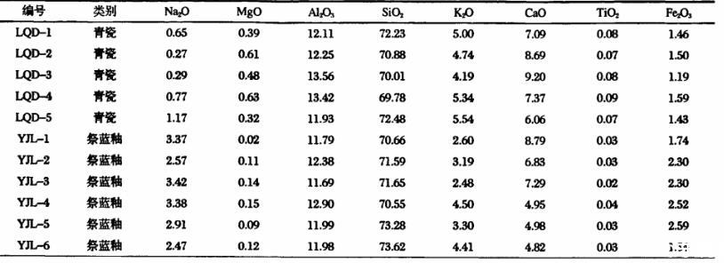 表2宋代龍泉青瓷釉和元代景德鎮元代祭藍釉的主、次量元素組成