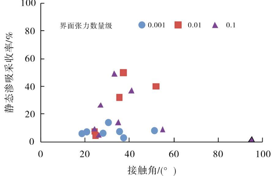 從圖1可知,界面張力大于0.01 mN·m-1時,高接觸角時反而滲吸采收率整體更高。當接觸角小于30°時,靜態滲吸采收率最高為26.67%,平均為10.66%;當接觸角大于30°時,靜態滲吸采收率最高為50%,平均為33.15%。從圖2、表1可知,當接觸角大于30°時,滲吸液的界面張力平均為0.096 mN·m-1;當接觸角小于30°時,界面張力則減小到0.043 mN·m-1,這是由于低的接觸角需要更高的表面活性劑濃度(接觸角小于30°時,表面活性劑濃度平均為0.259%;接觸角大于30°時,表面活性劑濃度平均為0.190%),從而導致界面張力降低。因此,化學滲吸時若使用表面活性劑類潤濕劑,應使用合適的濃度,避免為了追求低接觸角導致界面張力過小。