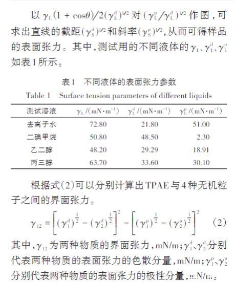 根據式(2)可以分別計算出TPAE與4種無機粒子之間的界面張力。