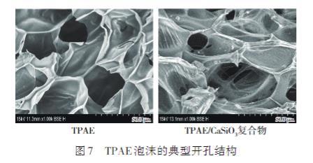 根據TPAE/無機粒子復合物泡沫的泡孔結構圖可以看出,相比較于純TPAE泡沫的閉孔結構,無機粒子的添加明顯促進了TPAE泡沫泡孔的打開。為詳細探究無機粒子的開孔機制,使用真密度儀對不同TPAE/無機粒子復合物泡沫的開孔率進行了測試,如圖6所示。無機粒子的添加都提高了TPAE泡沫的開孔率,表明無機粒子的加入是影響開孔率的關鍵因素。基于TPAE和TPAE/CaSiO3復合物泡沫中的開孔結構分析無機粒子對復合物泡沫開孔結構的影響(以CaSiO3為例),如圖7所示。可以看出,純TPAE泡沫主要出現泡孔壁上,且形成的孔比較規則,這是由于純TPAE熔體強度低,泡孔壁容易破裂。而TPAE/CaSiO3復合物泡沫的開孔主要發生在泡孔的內壁以及幾個泡孔的相交處上,這是因為在泡孔生長過程中,由于CaSiO3的非均相成核,泡孔在CaSiO3分散相周圍成核生長,形成花狀的泡孔結構,而TPAE與無機粒子的相容性差,使得CaSiO3從泡孔壁上脫落,留下不規則的網狀結構,從而導致泡孔間相互連接。其他3種TPAE/無機粒子復合物泡沫的開孔形式同TPAE/CaSiO3復合物泡沫一致。圖8展示了兩種與TPAE具有不同界面張力的粒子(以CaSiO3和Talc為例)的添加對復合物泡沫開孔結構形成的影響機制。