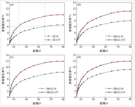 暴露在強(qiáng)紫外線輻射環(huán)境中的各組試樣的質(zhì)量損失率均明顯大于標(biāo)準(zhǔn)干燥環(huán)境中試樣的質(zhì)量損失率。在3~21 d齡期內(nèi),各組試樣在強(qiáng)紫外線輻射環(huán)境中的質(zhì)量損失增長速率明顯大于其在標(biāo)準(zhǔn)干燥環(huán)境中的質(zhì)量損失增長速率。以基準(zhǔn)組(JZ)為例,強(qiáng)紫外線輻射環(huán)境下水泥石在18 d齡期時的質(zhì)量損失率達(dá)到標(biāo)準(zhǔn)干燥環(huán)境下水泥石在60 d齡期時的質(zhì)量損失率(穩(wěn)定值),并最終在90 d齡期時,JZ-UV組的質(zhì)量損失率達(dá)到了JZ-N組的1.5倍。這是強(qiáng)紫外線輻射的“光化學(xué)作用”引起的。當(dāng)水分子吸收光子后,內(nèi)部的電子會發(fā)生能級躍遷,形成不穩(wěn)定的激發(fā)態(tài),并發(fā)生離解反應(yīng),使H—O鍵斷裂生成H+和HO-,從而加速水分子的運動,促進(jìn)了水泥石表面的干燥,增大了水泥石體系內(nèi)部與外部環(huán)境的濕度梯度,導(dǎo)致水泥石中的水分快速散失。