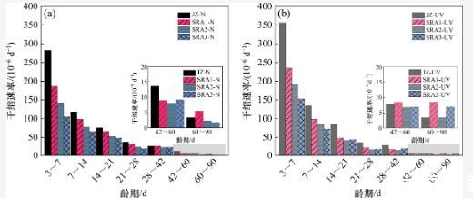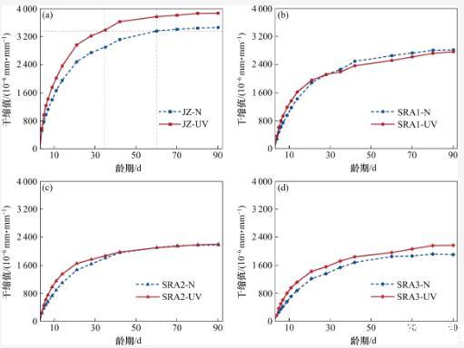 比較2種環(huán)境下各組試樣的干縮變形變化規(guī)律,發(fā)現(xiàn)基準(zhǔn)組與SRA試驗組呈現(xiàn)出不一樣的變化趨勢。由圖4可知,在強(qiáng)紫外線輻射環(huán)境下,基準(zhǔn)組(JZ)在3~21 d齡期內(nèi)的干縮速率遠(yuǎn)高于其在標(biāo)準(zhǔn)干燥環(huán)境下的干縮速率,最終表現(xiàn)為JZ組在強(qiáng)紫外線輻射環(huán)境下的干縮變形增加,說明在溫度和濕度一致的條件下,強(qiáng)紫外線輻射會增大水泥石的干縮變形。