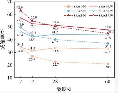 為了進(jìn)一步分析SRA試驗組在2種環(huán)境下干縮變形隨摻量變化的規(guī)律,計算了SRA試驗組相對于基準(zhǔn)組的干縮降低率,即減縮率。計算結(jié)果如圖5所示:在試驗齡期內(nèi),摻加SRA的水泥石在強(qiáng)紫外線輻射環(huán)境下的減縮率維持在相對穩(wěn)定的水平;14 d齡期后,相同摻量的SRA試驗組在強(qiáng)紫外線輻射環(huán)境下的減縮率逐漸接近并最終超過其在標(biāo)準(zhǔn)干燥環(huán)境下的減縮率。然而,隨著減縮劑摻量的增加,強(qiáng)紫外線輻射環(huán)境下減縮率的提升幅度受到限制。具體而言,SRA摻量為3%時,減縮效果的提升幅度非常微弱。這也導(dǎo)致了在強(qiáng)紫外線輻射下,SRA試驗組的干縮變形增長幅度隨著摻量變化呈現(xiàn)出不同的規(guī)律。