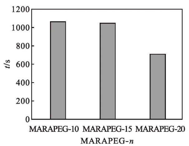 馬來酰蓖麻油酸聚乙二醇(n=10、15、20)酯的潤濕性能如圖5所示。由圖5可知:產品的潤濕時間隨著聚乙二醇聚合度的增大而增長。氧乙基數增加,其親水性增強,降低表面張力的能力減弱,潤濕性能減弱。
