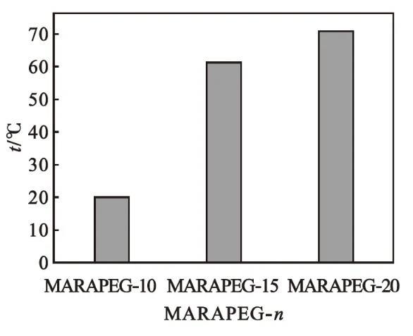 馬來酰蓖麻油酸聚乙二醇(n=10、15、20)酯的濁點如圖6所示。由圖6可知:產物的濁點范圍為20——71℃。隨著聚乙二醇聚合度的增加,產品的濁點逐漸升高。聚乙二醇聚合度越大,聚乙二醇醚鍵中的氧原子與水中氫原子形成的氫鍵越多,產品在水中的溶解性能越好。