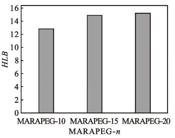 圖3馬來酰蓖麻油酸聚乙二醇(n=10、15、20)酯的HLB值