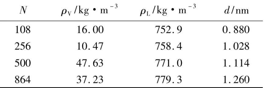 在溫度500 K和截斷半徑rc=0.9498 nm的條件下,當模擬分子數N=108、256、500和864時,模擬得到的密度分布見圖9。統計得到的汽相主體密度ρV、液相主體密度ρL及汽液界面厚度d見表5。