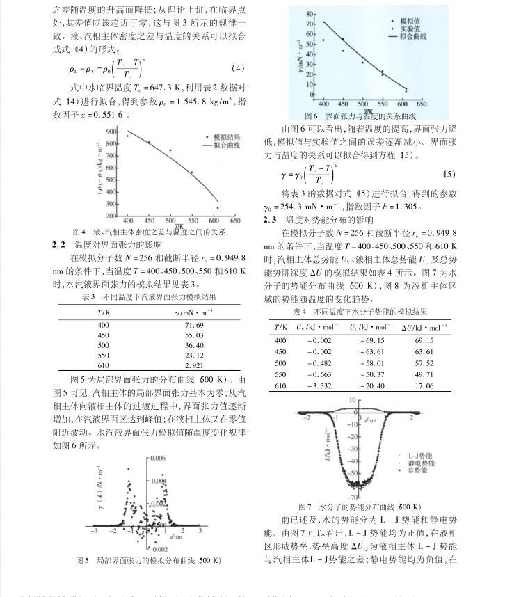 采用SPC模型,對水汽液界面特性的分子動力學模擬研究結果表明,隨著溫度的升高,汽相主體密度增加,汽液界面厚度增大,液相主體密度降低,界面張力逐漸減小,液相主體區域勢能的勢阱深度也逐漸降低。隨著模擬分子數的增加,液相主體密度增加,汽液界面厚度稍有增大。隨著截斷半徑的增加,液相主體密度增加,汽液界面厚度變化不大。