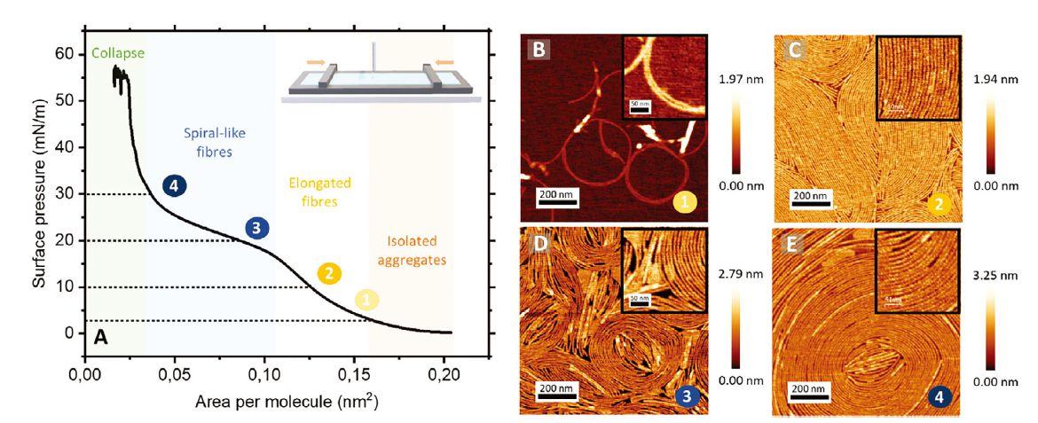圖3、A)在空氣/水界面上鋪展的FP2肽的壓縮等溫線π–A以及在3、10、20和30 mN m?1下獲得的LB肽膜的AFM顯微照片(分別為B、C、D和E))。