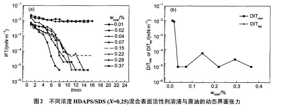 第一,HDAPS/SDS混合體系可以在無堿條件下與原油達到超低界面張力。HDAPS/SDS混合體系作為驅油劑不僅可以獲得利于提高剩余油洗油效率的超低界面張力,而且可以避免堿劑引起的一系列問題。