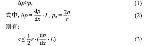 第三,HDAPS/SDS混合體系的動態界面張力達到超低界面張力的時間非常短,且能夠在極低的平衡界面張力下維持。由于在實際驅油過程中,驅油體系是在流動的狀態下與原油接觸,在短時間內達到超低界面張力,對原油從巖石上啟動非常有利。而且,HDAPS/SDS混合體系與原油的界面張力在總濃度超過0.04%后就可以達到極低的10-5mN·m-1量級。對于存在于半徑為r的毛細管中長度為L的剩余油滴,當油滴兩端的驅動壓差Δp大于等于毛細管壓力pc時,剩余油滴才能夠活化啟動,7即有: