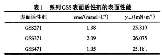 由表1可知,3種表面活性劑中GSS471的cmc較小,GSS271的cmc與之接近,GSS371的cmc最大。對于GSS371,由于連接基使兩條疏水鏈間的距離增大,導致疏水相互作用減弱,因而cmc較大;GSS371在表面定向排列疏松,在氣液界面置換的水分子較少,因此γcmc較大。連接基較短的GSS271,兩條疏水鏈距離較小,增強了疏水相互作用,cmc?。辉诒砻媾帕休^緊密致使γcmc較小。對于有較長連接基的GSS471,由于連接基的柔性作用使連接鏈扭曲變形而導致兩條疏水鏈更靠近,化學鍵又使極性頭基被強制在較小的距離內,兩種因素均使GSS471疏水能力增強[15],分子更易聚集在一起,因而cmc??;同時在表面排列更緊密,因而γcmc最小。