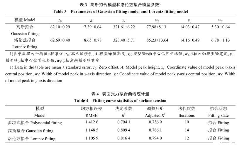 多項式擬合模型的參數(shù)(平均值±標(biāo)準(zhǔn)誤)如下所示:z0=116.16±43.94,A1=?0.23±0.10,A2=0.002±0.001,A3=(?1.19±0.45)×10?5,A4=(2.25±0.88)×10?8,A5=(?1.91±0.64)×10?11,B1=?19.950 0±19.724 9,B2=3.22±3.21,B3=?0.24±0.24,B4=0.009±0.008,B5=(?1.22±1.30)×10?4。表3為高斯擬合模型和洛倫茲擬合模型參數(shù),表4為溶液表面張力3種擬合曲線的統(tǒng)計量。由表4可以看出,3種擬合方式的決定系數(shù)(R2)均大于0.79,調(diào)整后R2(Adjusted R2)均大于0.73,這說明擬合函數(shù)有意義,且均方根誤差(Root mean square error,RMSE)都小于1.5。3種擬合模型均能夠描述磁場強度和磁化時長對除草劑溶液表面張力的影響,但相比較于其他2種擬合方式,洛倫茲擬合R2為0.816 4,調(diào)整后R2為0.794 0,兩者均大于其他2種擬合方式,R2與調(diào)整后R2越大,說明擬合效果越好;RMSE為1.105 9,均小于其他2種擬合方式,RMSE越小,說明預(yù)測模型描述試驗數(shù)據(jù)越精確。