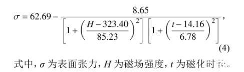 式中,z表示溶液表面張力,z0表示零點偏移量,x表示磁場強度,y表示磁化時長,A1~A5分別為x~x5的系數(shù),B1~B5分別為y~y5的系數(shù)。