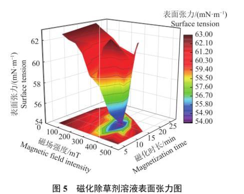 為了直觀地分析磁場強度和磁化時長2個因素共同作用對除草劑溶液表面張力的影響規(guī)律,建立以磁場強度和磁化時長為自變量、以溶液表面張力為因變量的二元函數(shù),使用OriginPro 2018繪制磁場強度和磁化時長對表面張力影響規(guī)律的空間曲面分布圖(圖5)。由圖5可以看出,磁場強度和磁化時長對溶液表面張力影響規(guī)律的空間曲面分布圖呈峰值為負值的高斯空間分布規(guī)律,即空心圓錐面分布,這說明并不是磁場強度越大或者磁化時間越長,除草劑溶液的表面張力就越小,而是存在處理效果最佳的磁場強度和磁化時長。磁化除草劑溶液表面張力試驗結(jié)果見表2。當(dāng)磁場強度為350 mT、磁化時長為15.0 min時,除草劑溶液表面張力值最小,為54.0 mN/m,下降14.96%,磁化效果最佳。