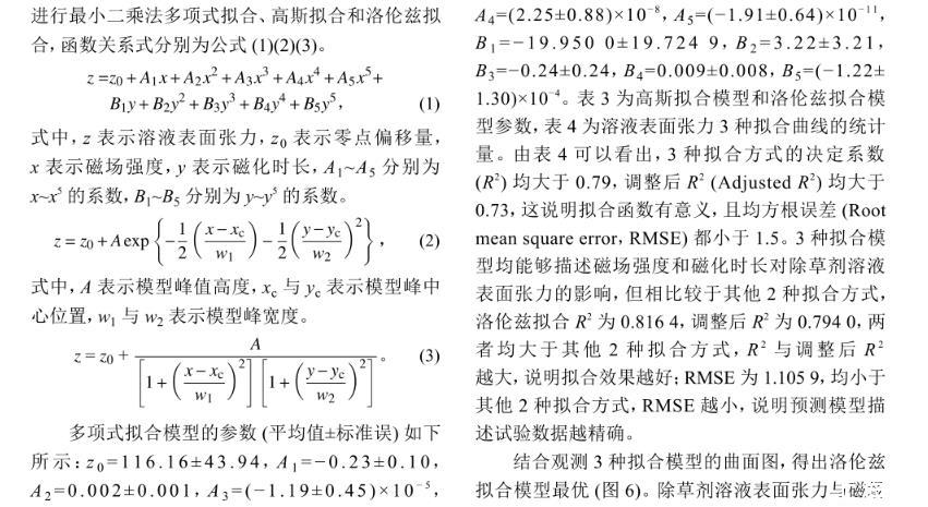 結(jié)合觀測3種擬合模型的曲面圖,得出洛倫茲擬合模型最優(yōu)(圖6)。除草劑溶液表面張力與磁場強度和磁化時長的關(guān)系式見公式(4),為研究磁化作用對除草劑溶液表面張力的影響提供理論參考。
