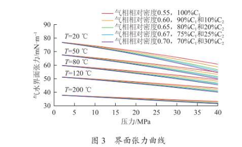 如圖3所示為利用新模型繪制的不同溫度和壓力下的界面張力曲線。從圖中可知,壓力越大,溫度越高,氣水界面張力越小;氣體相對密度越大,氣水界面張力越小。當壓力和溫度分別為0~40 MPa和20~200℃時,界面張力范圍為30~75 mN/m,不能看成常數(shù)。
