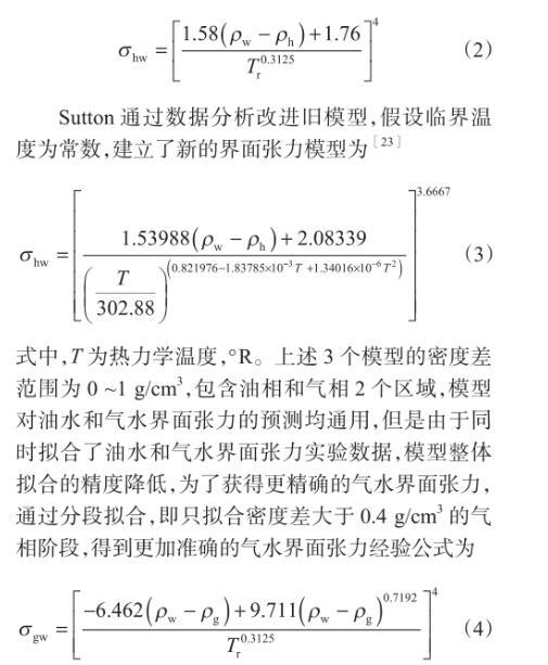 式中,T為熱力學溫度,°R。上述3個模型的密度差范圍為0~1 g/cm3,包含油相和氣相2個區(qū)域,模型對油水和氣水界面張力的預測均通用,但是由于同時擬合了油水和氣水界面張力實驗數(shù)據(jù),模型整體擬合的精度降低,為了獲得更精確的氣水界面張力,通過分段擬合,即只擬合密度差大于0.4 g/cm3的氣相階段,得到更加準確的氣水界面張力經(jīng)驗公式為