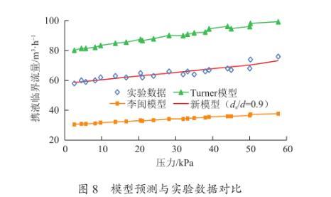 (3)液滴尺寸和變形對攜液臨界流量影響較大。當液滴特別小時,液滴在壓差下基本不發生形變,液滴基本呈球形,曳力系數近似0.44;隨著液滴直徑越大,液滴越容易變形,液滴高寬比越小,曳力系數越大,攜液臨界流速變小。考慮了液滴尺寸和液滴變形影響的新模型與實驗數據吻合良好。