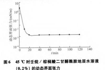 圖6 45℃時(shí)壬烷/棕櫚酸二甘醇酰胺地層水溶液(0.2%)的動(dòng)態(tài)界面張力