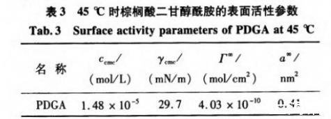 表3 45℃時(shí)棕櫚酸二甘醇酰胺的表面活性參數(shù)