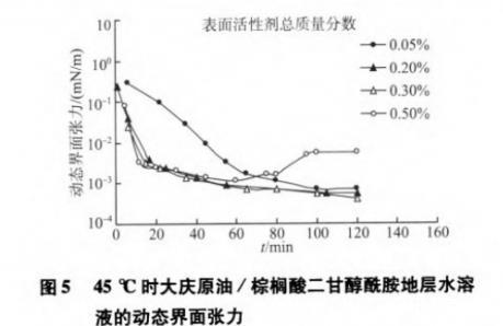 圖5 45℃時(shí)大慶原油/棕櫚酸二甘醇酰胺地層水溶液的動(dòng)態(tài)界面張力