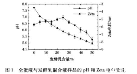 圖1全蛋液與發(fā)酵乳混合液樣品的pH和Zeta電位變化