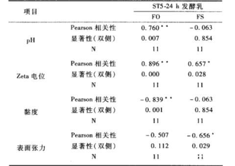 表1 pH值、Zeta電位、黏度、表面張力與蛋液起泡性質之間的相關性分析