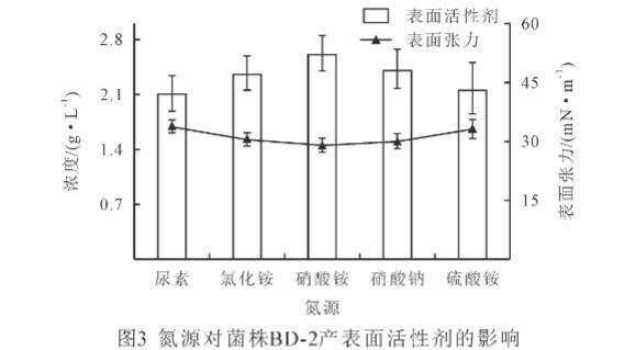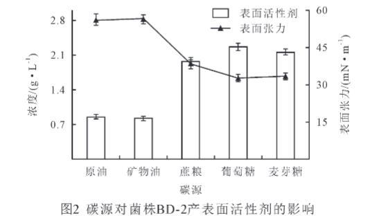 碳源對微生物的生長和次生代謝產物的產生有重要的影響。由圖2可知,不同碳源對菌株BD-2產表面活性劑量的影響不同,本實驗將原油、礦物油作為一類復雜碳源,葡萄糖、麥芽糖、蔗糖作為簡單碳源,進行對比分析發現,以簡單碳源作為底物時,菌株BD-2產表面活性劑的量顯著高于復雜碳源(P<0.05),其產表面活性劑量大小依次為葡萄糖>麥芽糖>蔗糖>原油>礦物油。同時以簡單碳源為底物時,菌株BD-2能顯著降低發酵液表面張力(P<0.05),其發酵液表面張力大小依次為原油>礦物油>蔗糖>麥芽糖>葡萄糖。在簡單碳源中,以葡萄糖為碳源時,菌株BD-2產生的表面活性劑的量最高,為2.26 g/L,而表面張力最低,為32.7 mN/m。研究結果表明,簡單碳源有利于菌株BD-2產表面活性劑。因此,選擇葡萄糖為菌株BD-2的碳源。