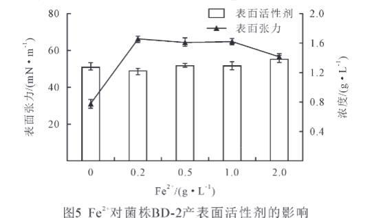 不同Mn2+、Fe2+濃度對菌株BD-2產表面活性劑的影響不同。由圖4可見,隨著Mn2+濃度的增加,表面活性劑量呈現先升高后降低的趨勢,而表面張力先下降后升高。Mn2+濃度0.5~1 g/L,表面活性劑量明顯升高,在1 g/L時,表面活性劑量最大,為2 g/L,而表面張力從30.9 mN/m下降到26.2 mN/m。在1%以后,表面活性劑量顯著下降(P<0.05),由2g/L下降到1.36 g/L,而表面張力顯著上升(P<0.05),由26.2 mN/m上升到39.2 mN/m。結果研究表明,菌株BD-2在Mn2+濃度為1 g/L的表面活性劑量最多,表面張力最小。因此,菌株BD-2的最適Mn2+濃度為1%。