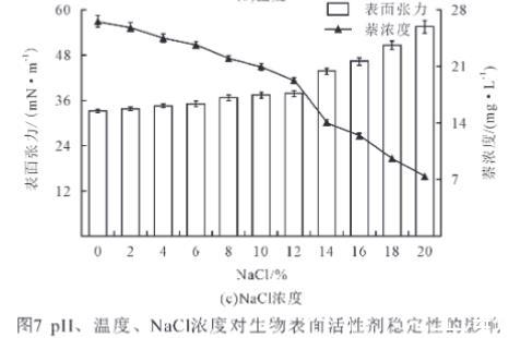 如圖7(c)所示,隨著NaCl濃度增加,萘濃度顯著下降(P<0.05),但NaCl濃度在8%以內,萘濃度均高于21 mg/L,表明生物表面活性劑對萘的增溶穩定;而液體表面張力總體呈現上升的趨勢,其中,NaCl濃度12%以內,液體表面張力變化不顯著(P>0.05),說明菌株BD-2產的生物表面活性劑能夠在一定鹽度范圍內,較好地降低液面張力。