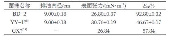 通過驅油試驗、表面張力和乳化指數的測定對菌株BD-2產生的生物表面活性劑性能進行分析,并與其他研究菌株比較,結果見表1。菌株BD-2產生的表面活性物質,能夠形成直徑約為9.0 cm的排油圈,可以將發酵液的表面張力由68.30 mN/m降到26.80 mN/m,乳化能力可達92.80%,與已發表的Shewanella sp.YY-1和Bacillus cereus GX7相比,菌株BD-2產生的生物表面活性劑具有較強的降低液面張力能力和乳化活性。