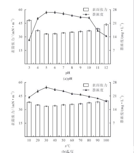 由圖6(b)可得,在10~30℃表面活性劑量明顯增加,在30℃時表面活性劑量達到最大,為2.18 g/L,表面張力明顯降低,從38.2 mN/m降低到23.2 mN/m;而溫度超過30℃后表面活性劑量顯著下降(P<0.05),表面活性劑量由2.18 g/L降低到0.85 g/L。表面張力顯著增加(P<0.05),表面張力由23.2 mN/m增加到35.1 mN/m。