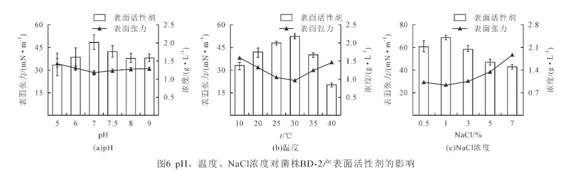 對菌株BD-2在不同的環境條件下進行了發酵實驗。如圖6(a)所示,pH在5~7之間,生物表面活性劑量明顯增加,在pH為7時,表面活性劑量最高,為1.64 g/L,而發酵液表面張力由34.3 N/m下降到28.2 mN/m。pH大于7后生物表面活性劑量顯著下降(P<0.05),表面活性劑量由2.01 g/L下降到1.57 g/L。pH為7后表面張力顯著上升(P<0.05),表面張力由28.2 mN/m升高到31.1 mN/m。研究結果表明,菌株BD-2在pH為7時生物表面活性劑量最多、表面張力最低,因此,菌株BD-2的最適發酵pH為7。